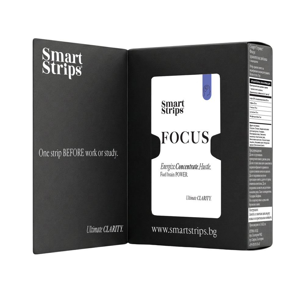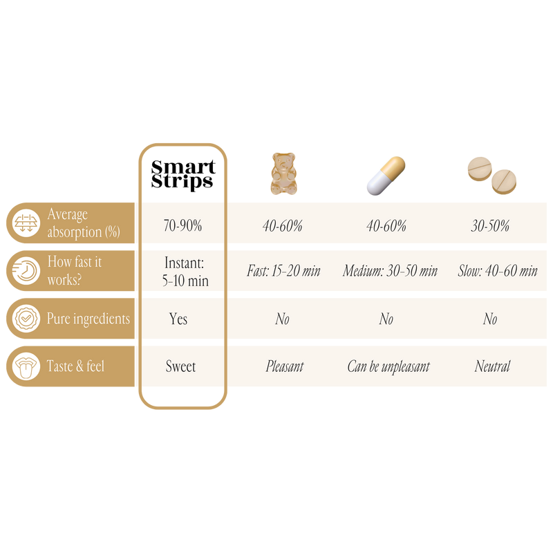 Smart Strips™ are designed to meet the modern demands of reality - they dissolve on the tongue and start working in less than 10 seconds. No water. No swallowing large tablets. No waiting. Unlike capsules and powder supplements, which lose their effectiveness after digestion, these ultra-thin oral strips achieve up to 95% bioavailability by being absorbed directly through the oral mucosa. This means not only faster action - but more effective, more uniform, more reliable.